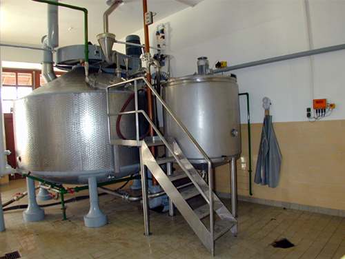 dient. Der Maischbottich hat einen Inhalt von maximal 100 hl und wird von einem