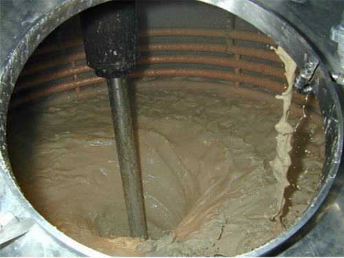 Die Rohstoffe werden in einer Mühle vermahlen und mit der benötigten Menge Wasser