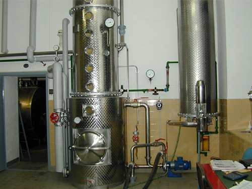 ausgegorene Maische in den Destillierturm pumpt.